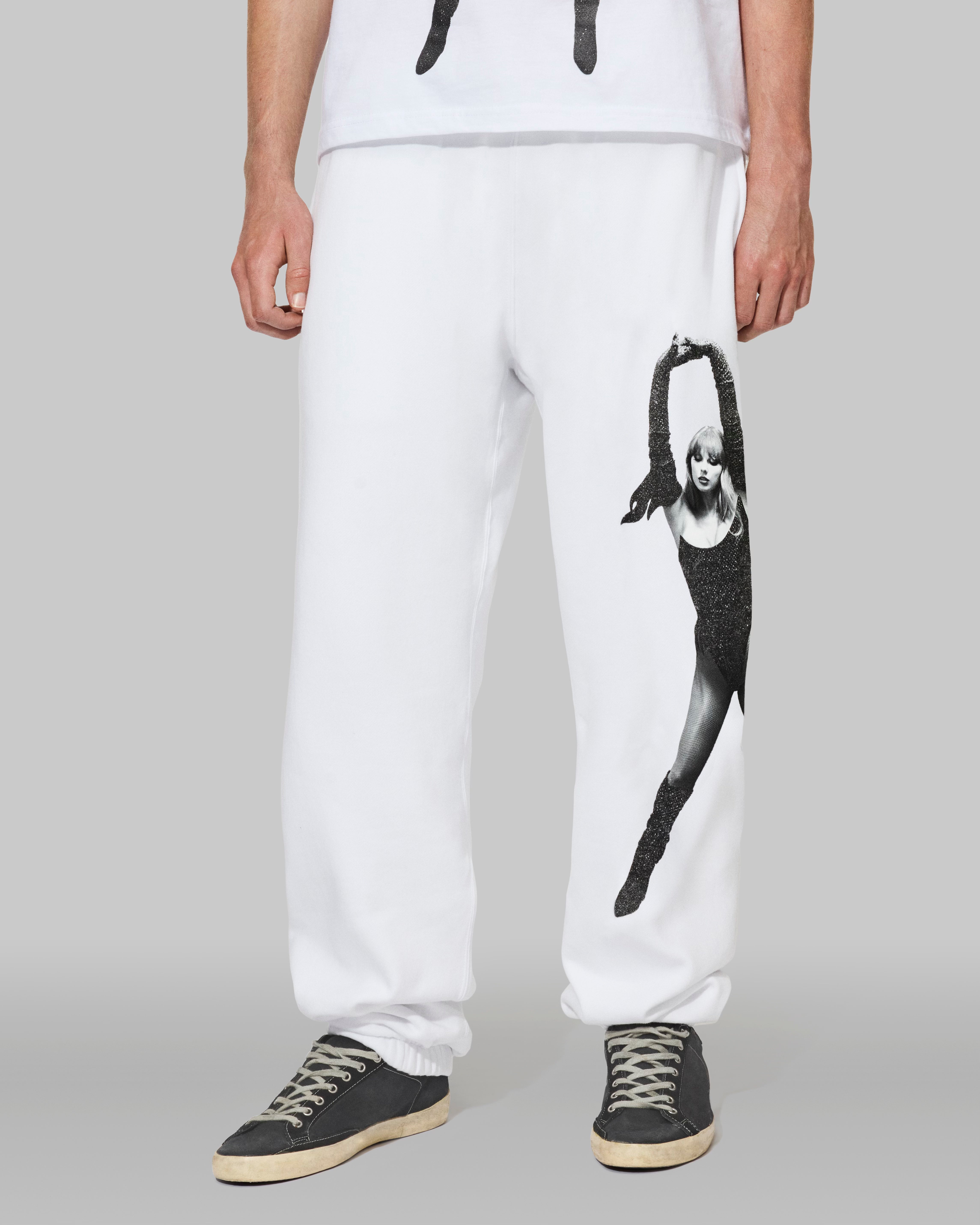 White sweatpants featuring photo of Taylor Swift with black sparkle outfit accents printed down wearer's left leg and "The Life of a Showgirl" album logo printed down wearer's right leg.